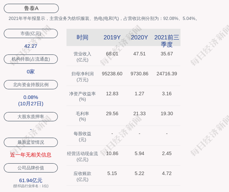 2021年半年报显示,鲁泰A的主营业务为纺织服装、热电(电和汽),占营收比例分别为:92.08%、5.04%。