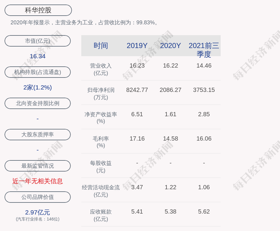 2020年年报显示,科华控股的主营业务为工业,占营收比例为:99.83%。
