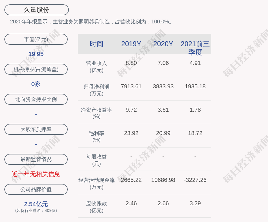 2020年年报显示,久量股份的主营业务为照明器具制造,占营收比例为:100.0%。