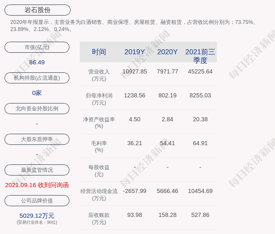 2020年年报显示,岩石股份的主营业务为白酒销售、商业保理、房屋租赁、融资租赁,占营收比例分别为:73.75%、23.89%、2.12%、0.24%。