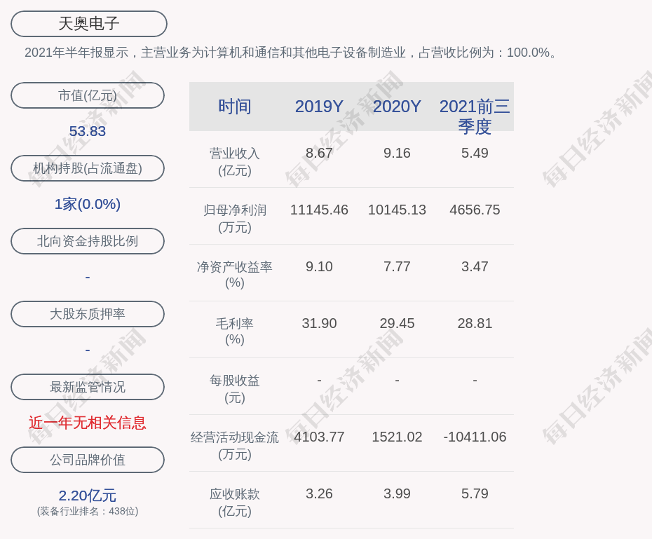 2021年半年报显示,天奥电子的主营业务为计算机和通信和其他电子设备制造业,占营收比例为:100.0%。