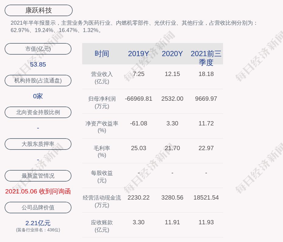 2021年半年报显示,康跃科技的主营业务为医药行业、内燃机零部件、光伏行业、其他行业,占营收比例分别为:62.97%、19.24%、16.47%、1.32%。