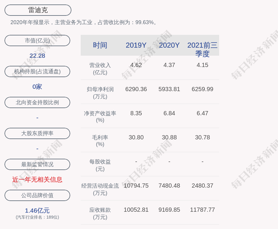 2020年年报显示,雷迪克的主营业务为工业,占营收比例为:99.63%。