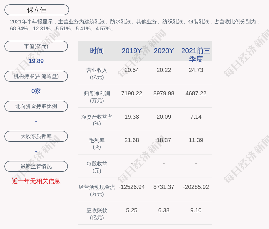 2021年半年报显示,保立佳的主营业务为建筑乳液、防水乳液、其他业务、纺织乳液、包装乳液,占营收比例分别为:68.84%、12.31%、5.51%、5.41%、4.57%。