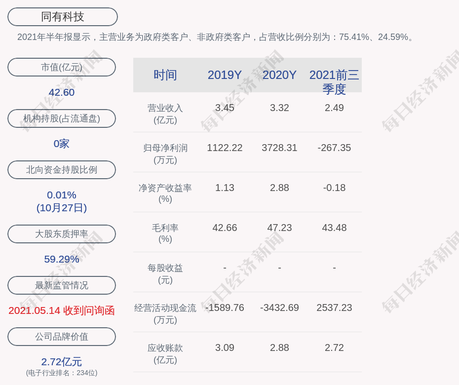 2021年半年报显示,同有科技的主营业务为政府类客户、非政府类客户,占营收比例分别为:75.41%、24.59%。
