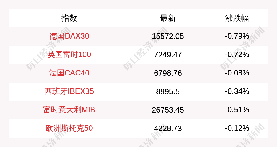 每经AI快讯:北京时间10月29日15:00,德国DAX30指数开盘下跌124.28点,跌幅为0.79%,报15572.05点;英国富时100指数开盘下跌52.11点,跌幅为0.72%,报7197.36点;法国CAC40指数开盘下跌5.46点,跌幅为0.08%,报6798.76点;西班牙IBEX35指数开盘下跌30.3点,跌幅为0.34%,报8995.5点;富时意大利MIB指数开盘下跌136.9点,跌幅为0.51%,报26753.45点;欧洲斯托克50指数开盘下跌5.14点,跌幅为0.12%,报4228.73点。