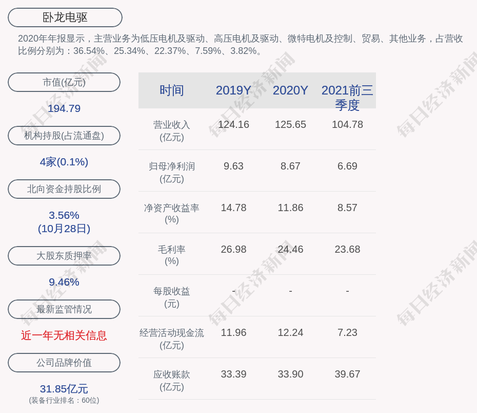 2020年年报显示,卧龙电驱的主营业务为低压电机及驱动、高压电机及驱动、微特电机及控制、贸易、其他业务,占营收比例分别为:36.54%、25.34%、22.37%、7.59%、3.82%。
