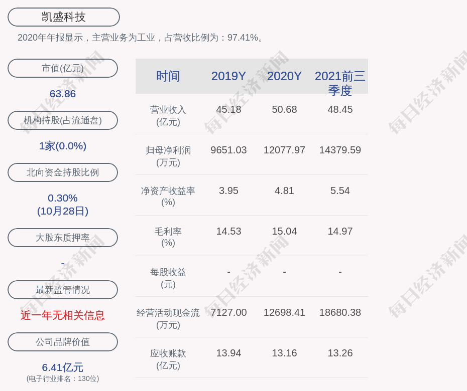 2020年年报显示,凯盛科技的主营业务为工业,占营收比例为:97.41%。