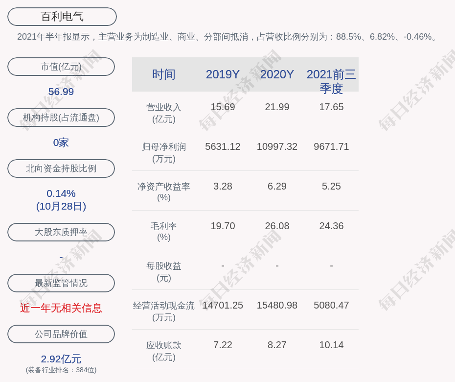 2021年半年报显示,百利电气的主营业务为制造业、商业、分部间抵消,占营收比例分别为:88.5%、6.82%、-0.46%。