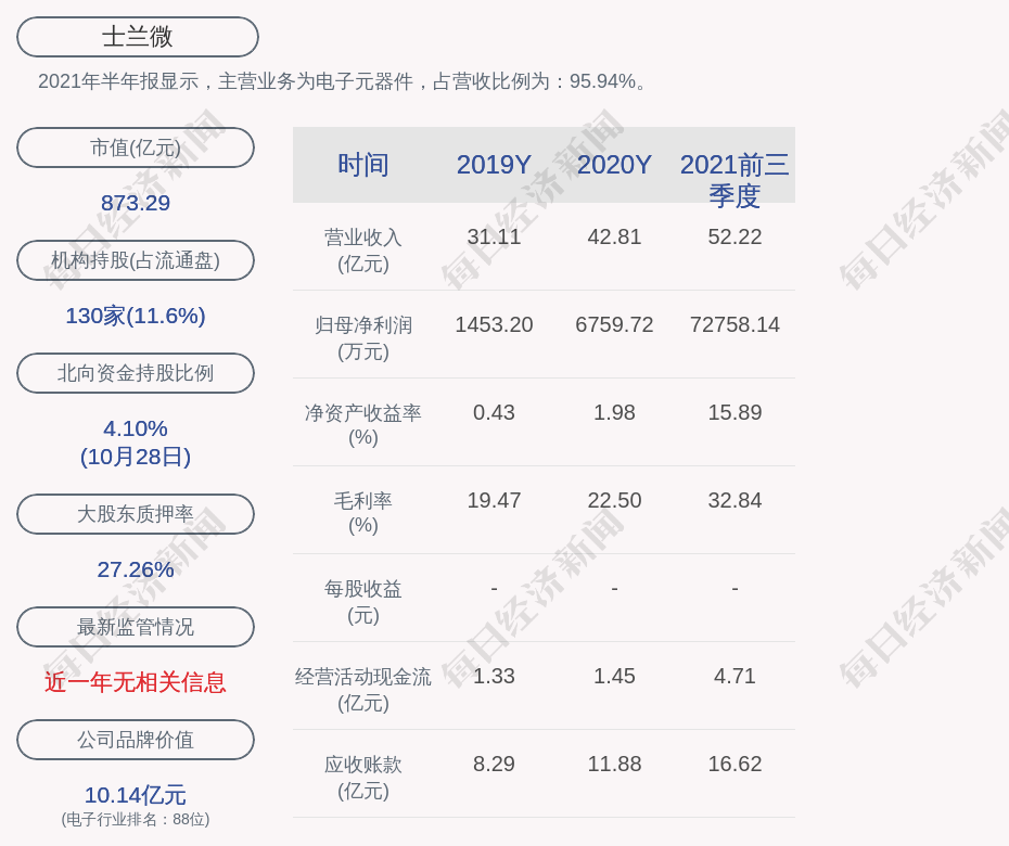 2021年半年报显示,士兰微的主营业务为电子元器件,占营收比例为:95.94%。