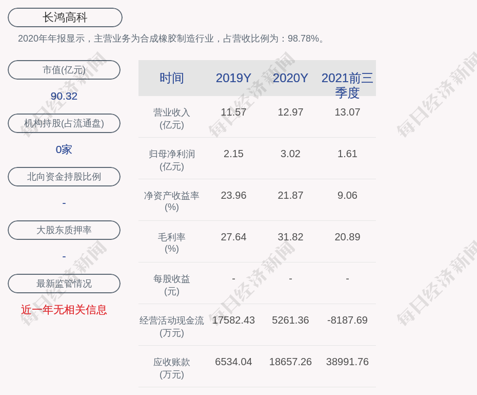 2020年年报显示,长鸿高科的主营业务为合成橡胶制造行业,占营收比例为:98.78%。