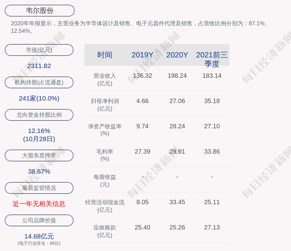 2020年年报显示,韦尔股份的主营业务为半导体设计及销售、电子元器件代理及销售,占营收比例分别为:87.1%、12.54%。