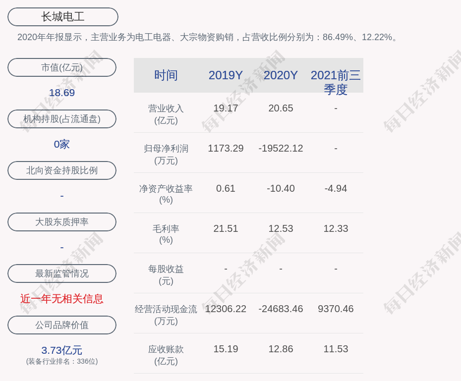 2020年年报显示,长城电工的主营业务为电工电器、大宗物资购销,占营收比例分别为:86.49%、12.22%。