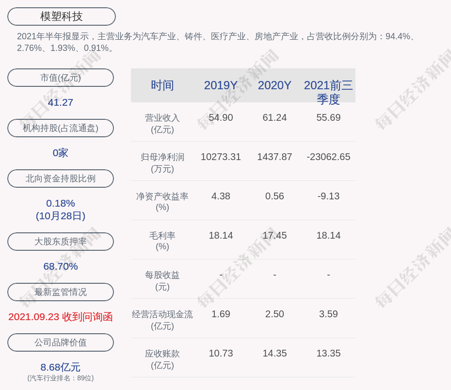 2021年半年报显示,模塑科技的主营业务为汽车产业、铸件、医疗产业、房地产产业,占营收比例分别为:94.4%、2.76%、1.93%、0.91%。