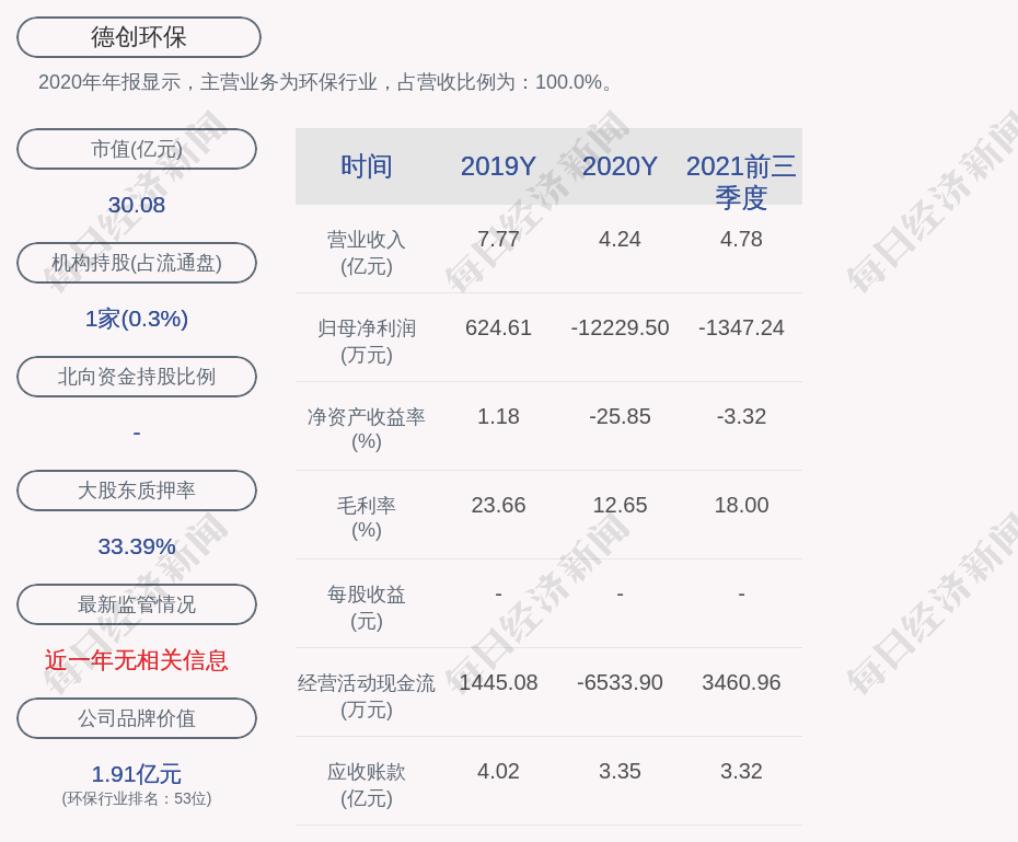 2020年年报显示,德创环保的主营业务为环保行业,占营收比例为:100.0%。