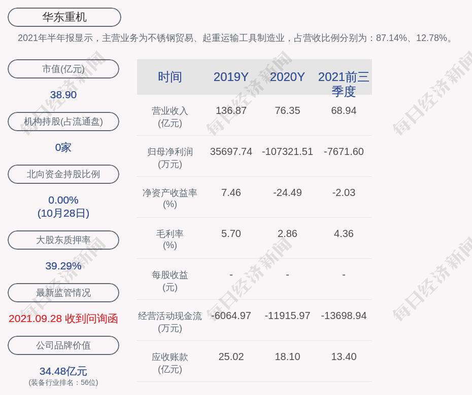 2021年半年报显示,华东重机的主营业务为不锈钢贸易、起重运输工具制造业,占营收比例分别为:87.14%、12.78%。