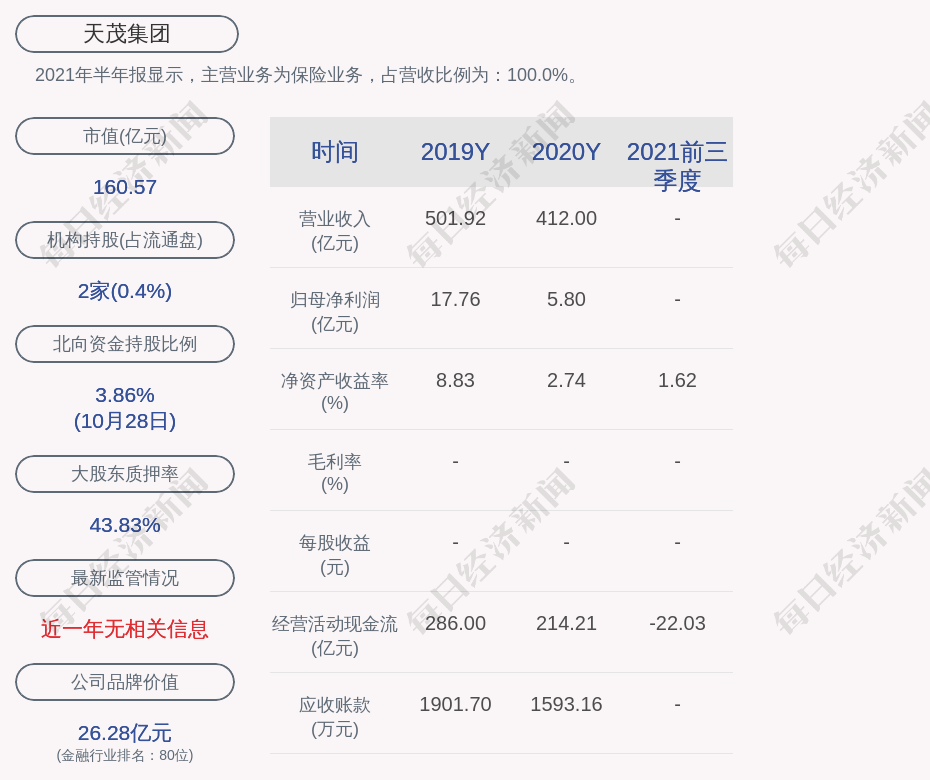 2021年半年报显示,天茂集团的主营业务为保险业务,占营收比例为:100.0%。