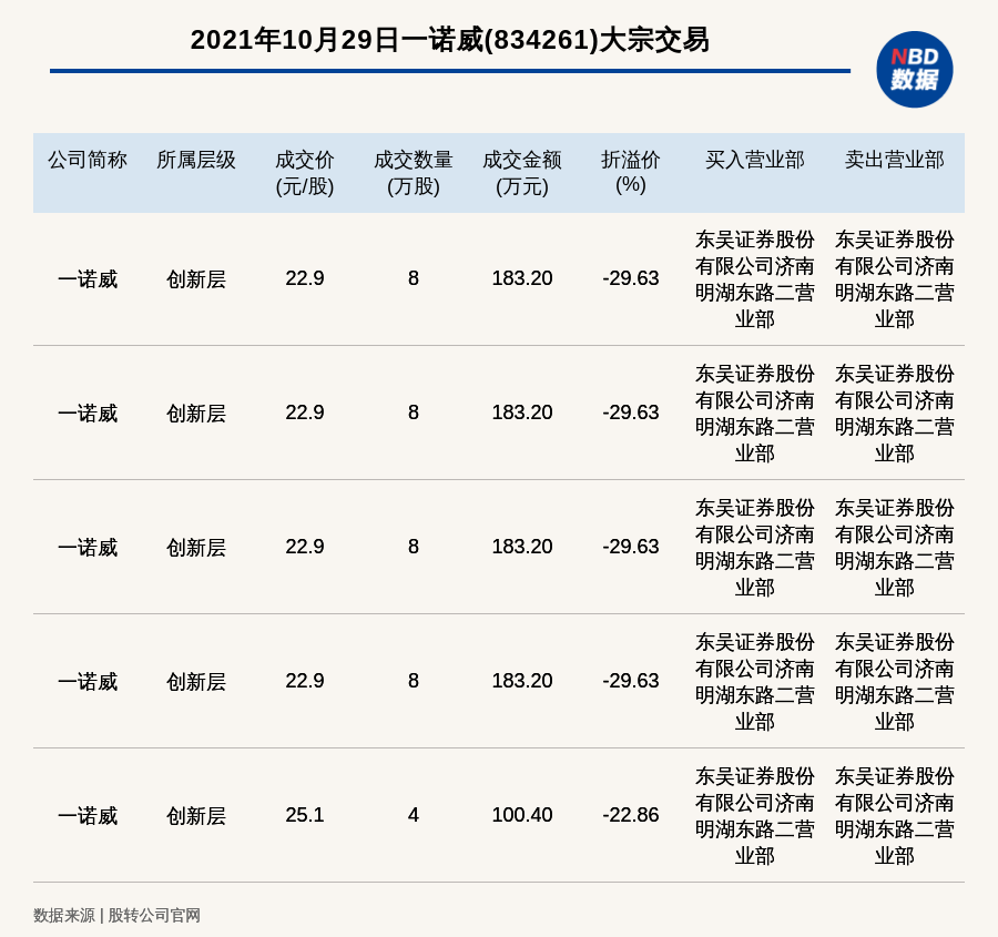 每经AI快讯,2021年10月29日,新三板创新层公司一诺威(834261)发生5笔大宗交易,总成交金额为833.20万元,成交金额最高的一笔成交价22.9元/股,成交数量8万股,成交金额183.20万元,折价29.63%。买入营业部是东吴证券股份有限公司济南明湖东路二营业部,卖出营业部是东吴证券股份有限公司济南明湖东路二营业部。