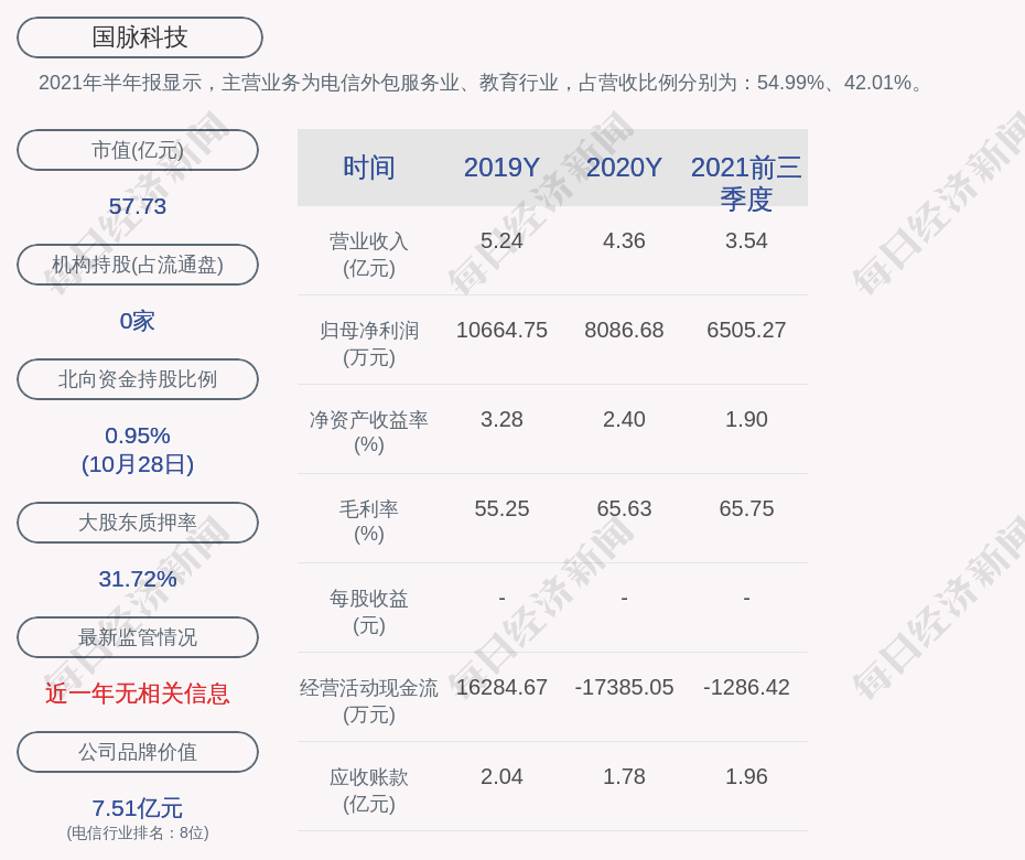 2021年半年报显示,国脉科技的主营业务为电信外包服务业、教育行业,占营收比例分别为:54.99%、42.01%。
