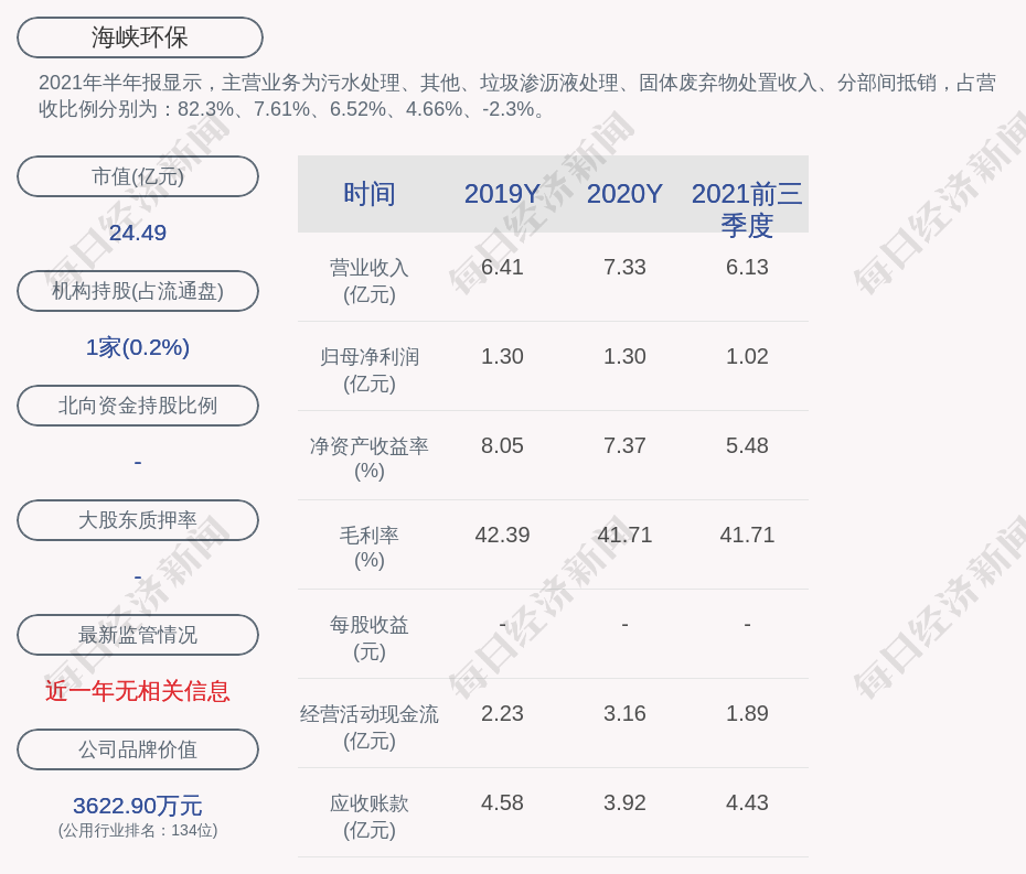 2021年半年报显示,海峡环保的主营业务为污水处理、其他、垃圾渗沥液处理、固体废弃物处置收入、分部间抵销,占营收比例分别为:82.3%、7.61%、6.52%、4.66%、-2.3%。