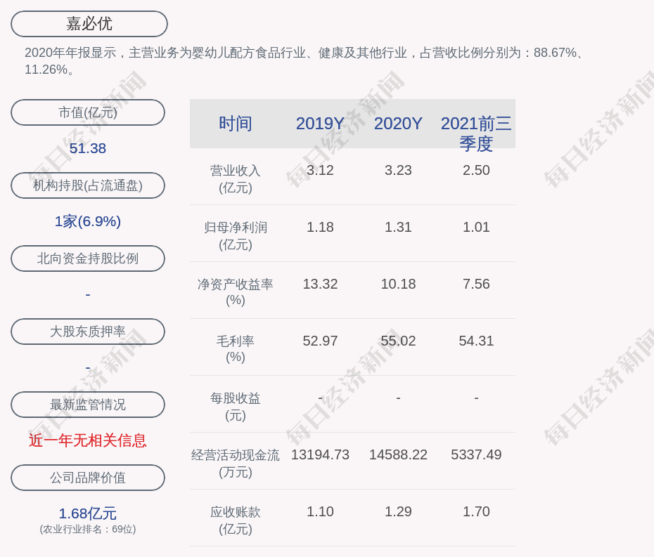 2020年年报显示,嘉必优的主营业务为婴幼儿配方食品行业、健康及其他行业,占营收比例分别为:88.67%、11.26%。