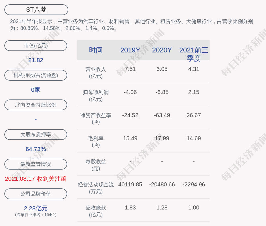 2021年半年报显示,ST八菱的主营业务为汽车行业、材料销售、其他行业、租赁业务、大健康行业,占营收比例分别为:80.86%、14.58%、2.66%、1.4%、0.5%。