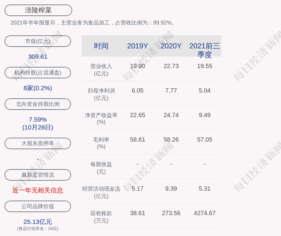 2021年半年报显示,涪陵榨菜的主营业务为食品加工,占营收比例为:99.92%。
