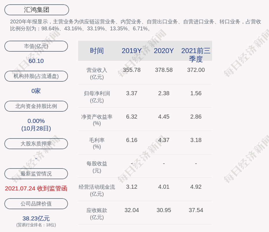 2020年年报显示,汇鸿集团的主营业务为供应链运营业务、内贸业务、自营出口业务、自营进口业务、转口业务,占营收比例分别为:98.64%、43.16%、33.19%、13.35%、6.71%。