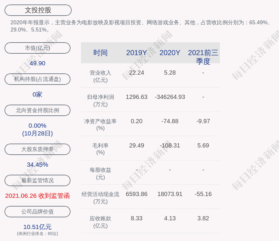 2020年年报显示,文投控股的主营业务为电影放映及影视项目投资、网络游戏业务、其他,占营收比例分别为:65.49%、29.0%、5.51%。