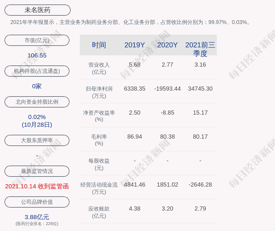 2021年半年报显示,未名医药的主营业务为制药业务分部、化工业务分部,占营收比例分别为:99.97%、0.03%。