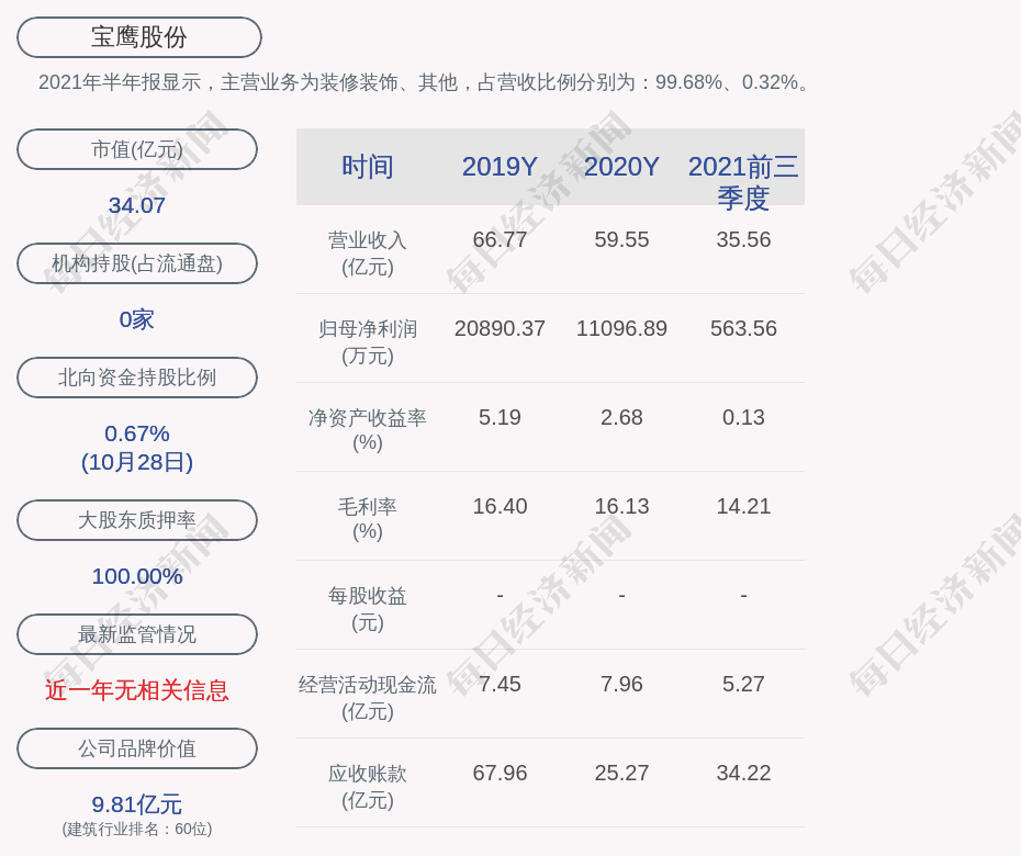 2021年半年报显示,宝鹰股份的主营业务为装修装饰、其他,占营收比例分别为:99.68%、0.32%。