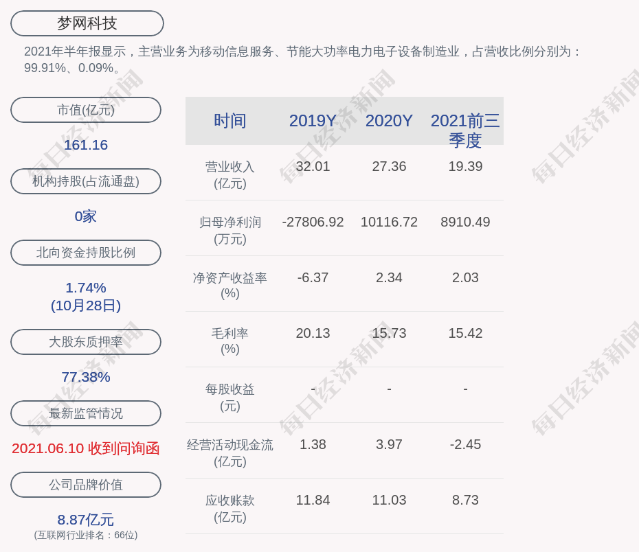 2021年半年报显示,梦网科技的主营业务为移动信息服务、节能大功率电力电子设备制造业,占营收比例分别为:99.91%、0.09%。