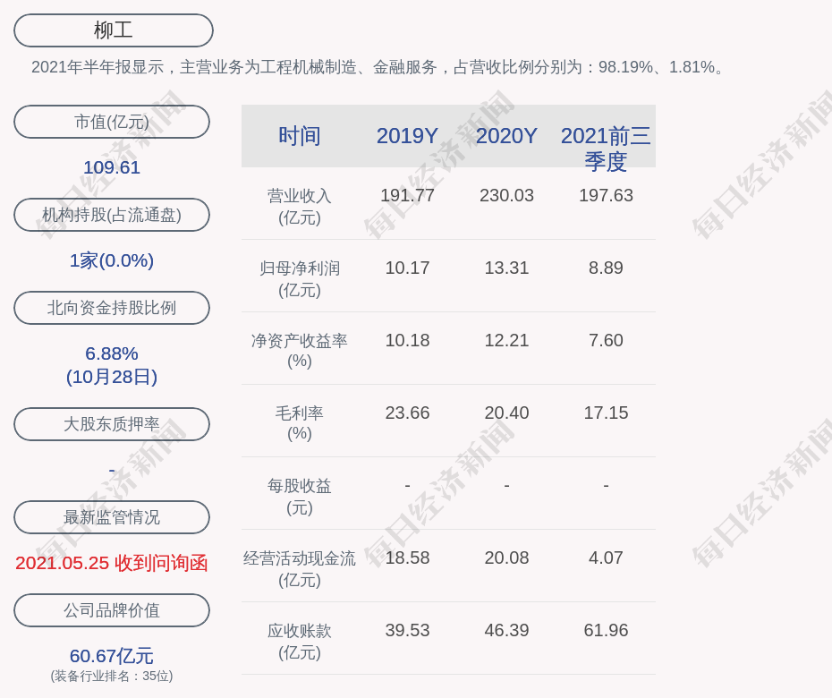 2021年半年报显示,柳工的主营业务为工程机械制造、金融服务,占营收比例分别为:98.19%、1.81%。