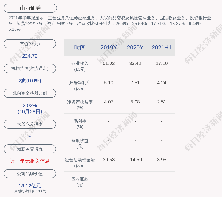 2021年半年报显示,山西证券的主营业务为证券经纪业务、大宗商品交易及风险管理业务、固定收益业务、投资银行业务、期货经纪业务、资产管理业务,占营收比例分别为:26.4%、25.59%、17.71%、13.27%、9.44%、5.16%。
