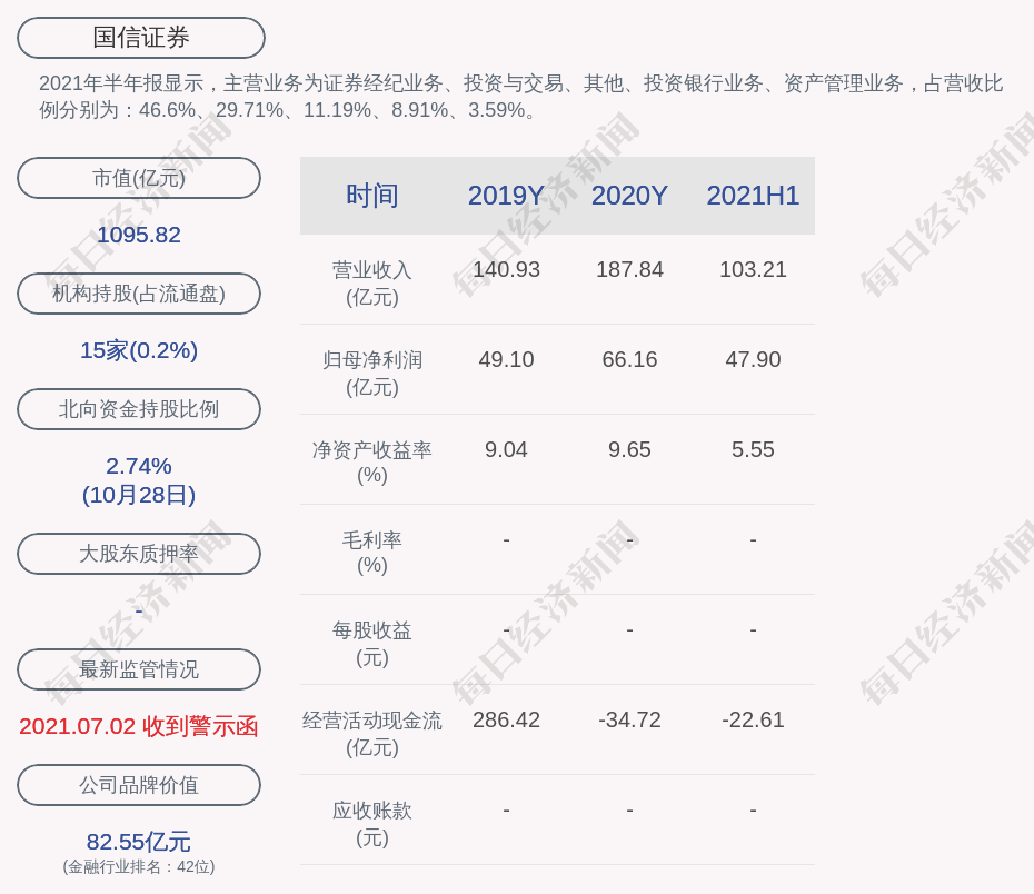 2021年半年报显示,国信证券的主营业务为证券经纪业务、投资与交易、其他、投资银行业务、资产管理业务,占营收比例分别为:46.6%、29.71%、11.19%、8.91%、3.59%。