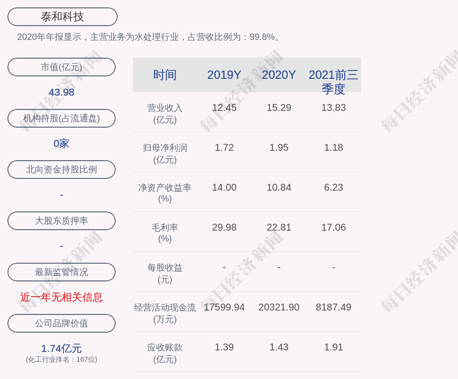2020年年报显示,泰和科技的主营业务为水处理行业,占营收比例为:99.8%。