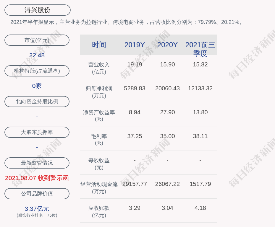 2021年半年报显示,浔兴股份的主营业务为拉链行业、跨境电商业务,占营收比例分别为:79.79%、20.21%。