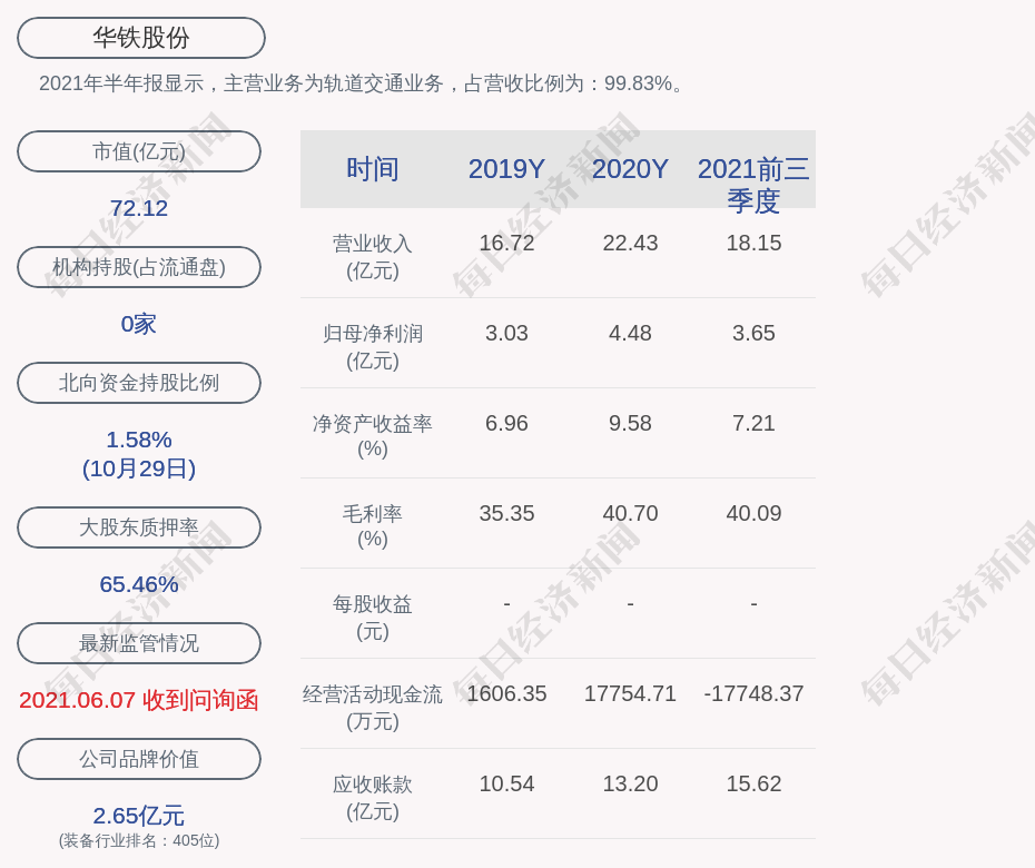 2021年半年报显示,华铁股份的主营业务为轨道交通业务,占营收比例为:99.83%。