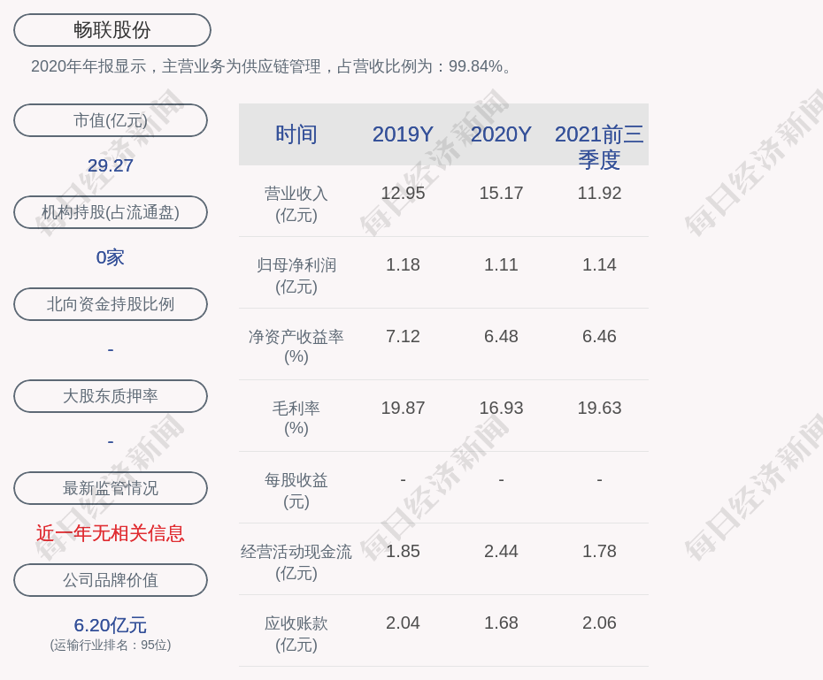 2020年年报显示,畅联股份的主营业务为供应链管理,占营收比例为:99.84%。