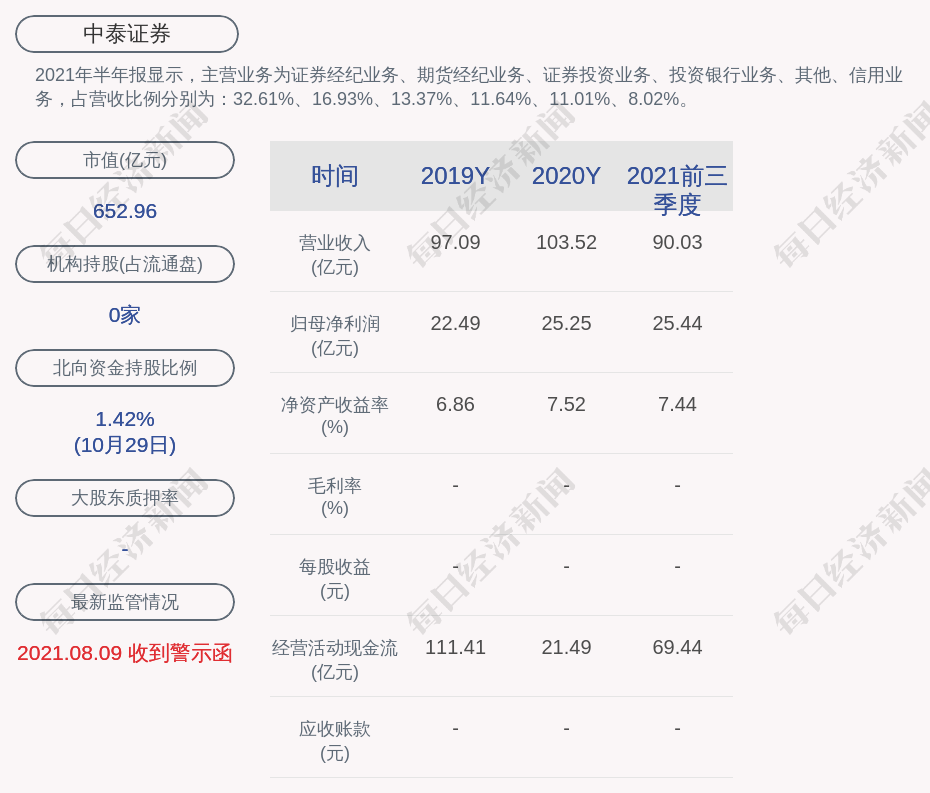 2021年半年报显示,中泰证券的主营业务为证券经纪业务、期货经纪业务、证券投资业务、投资银行业务、其他、信用业务,占营收比例分别为:32.61%、16.93%、13.37%、11.64%、11.01%、8.02%。