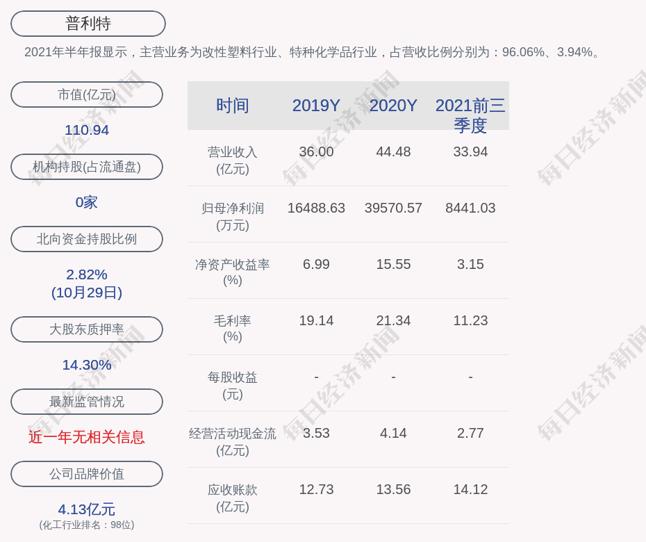 2021年半年报显示,普利特的主营业务为改性塑料行业、特种化学品行业,占营收比例分别为:96.06%、3.94%。