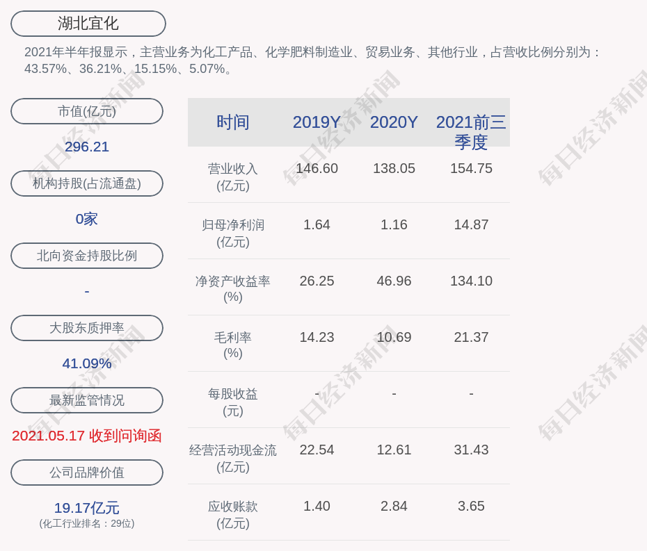 2021年半年报显示,湖北宜化的主营业务为化工产品、化学肥料制造业、贸易业务、其他行业,占营收比例分别为:43.57%、36.21%、15.15%、5.07%。