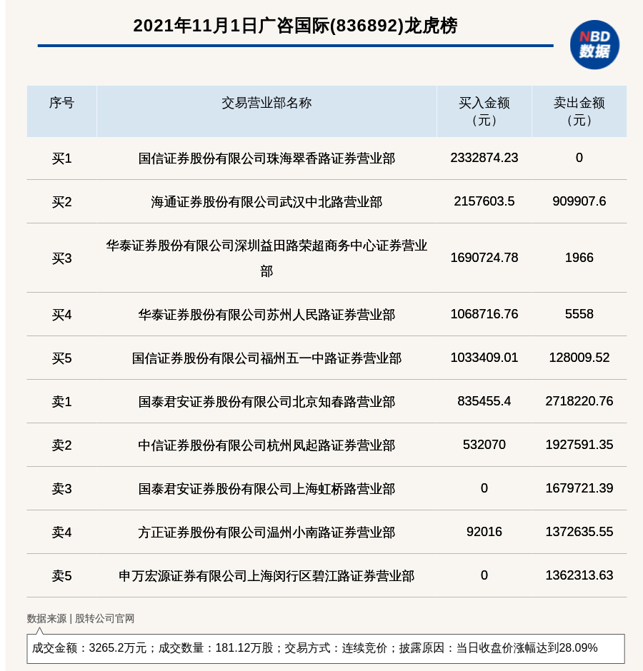 每经讯,2021年11月1日,广咨国际(836892)登上龙虎榜,交易方式是连续竞价,披露原因是当日收盘价涨幅达到28.09%,成交数量181.12万股,成交金额3,265.2万元。买一席位为国信证券股份有限公司珠海翠香路证券营业部,买入233.29万元;卖一席位为国泰君安证券股份有限公司北京知春路营业部,卖出271.82万元。