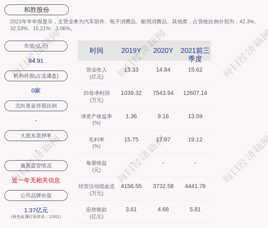 2021年半年报显示,和胜股份的主营业务为汽车部件、电子消费品、耐用消费品、其他类,占营收比例分别为:42.3%、32.53%、15.21%、3.06%。