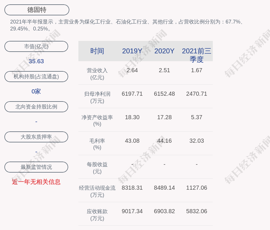 2021年半年报显示,德固特的主营业务为煤化工行业、石油化工行业、其他行业,占营收比例分别为:67.7%、29.45%、0.25%。