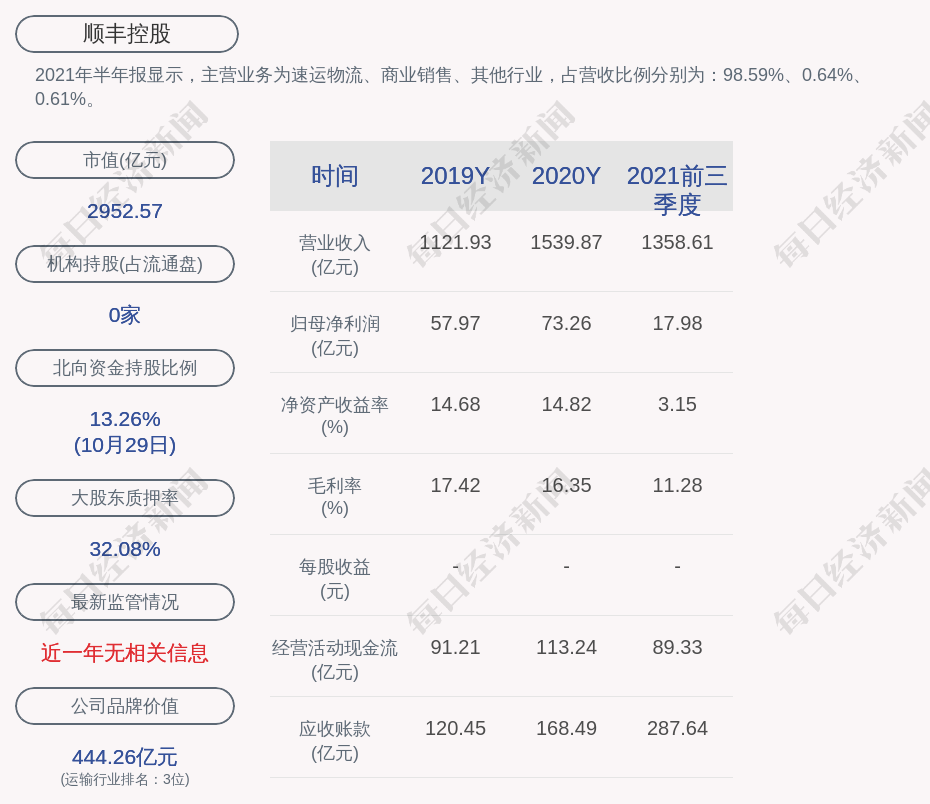 2021年半年报显示,顺丰控股的主营业务为速运物流、商业销售、其他行业,占营收比例分别为:98.59%、0.64%、0.61%。