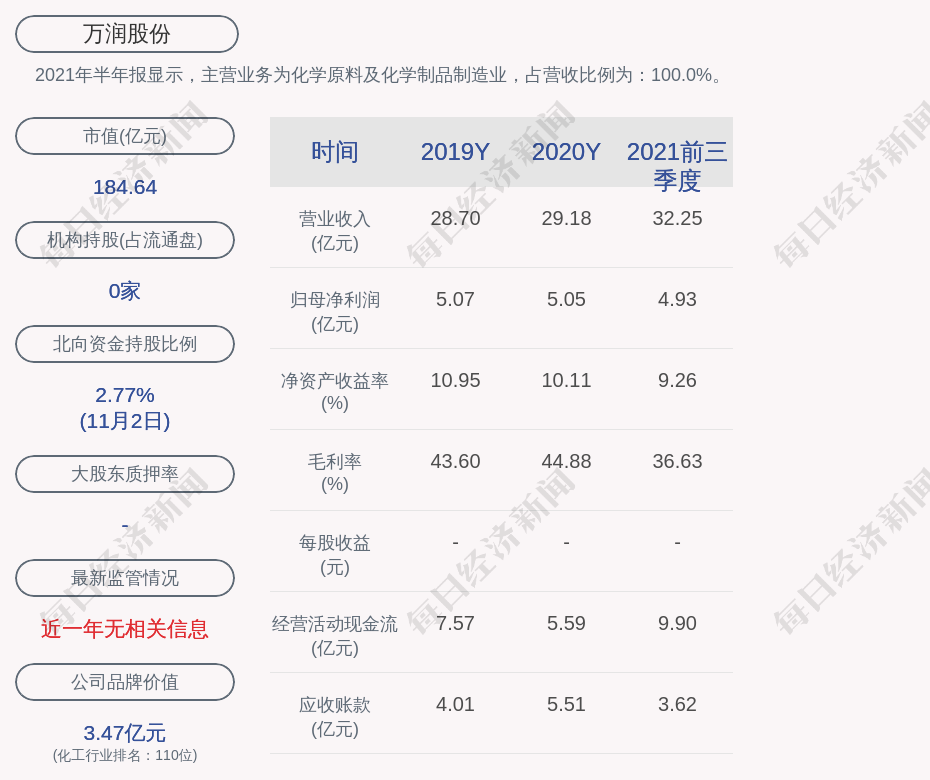 2021年半年报显示,万润股份的主营业务为化学原料及化学制品制造业,占营收比例为:100.0%。