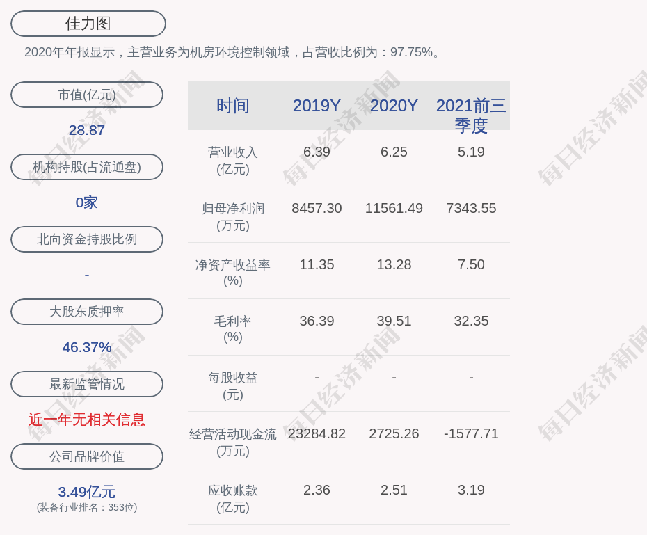 2020年年报显示,佳力图的主营业务为机房环境控制领域,占营收比例为:97.75%。