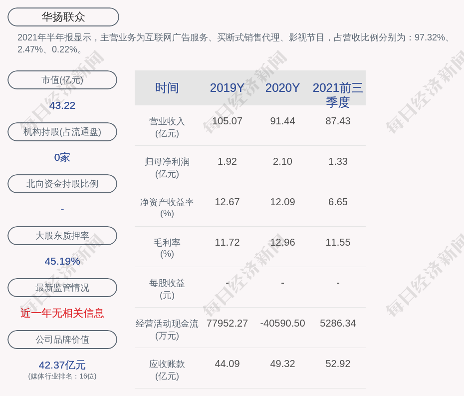 2021年半年报显示,华扬联众的主营业务为互联网广告服务、买断式销售代理、影视节目,占营收比例分别为:97.32%、2.47%、0.22%。
