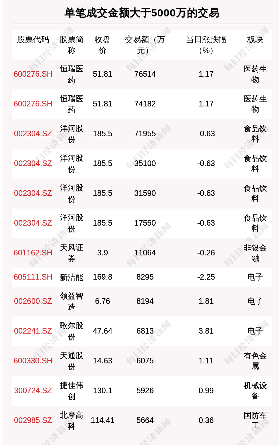 每经AI快讯,2021年11月5日,沪深两市一共发生143笔大宗交易,共成交51.26亿元,涉及101家上市公司。